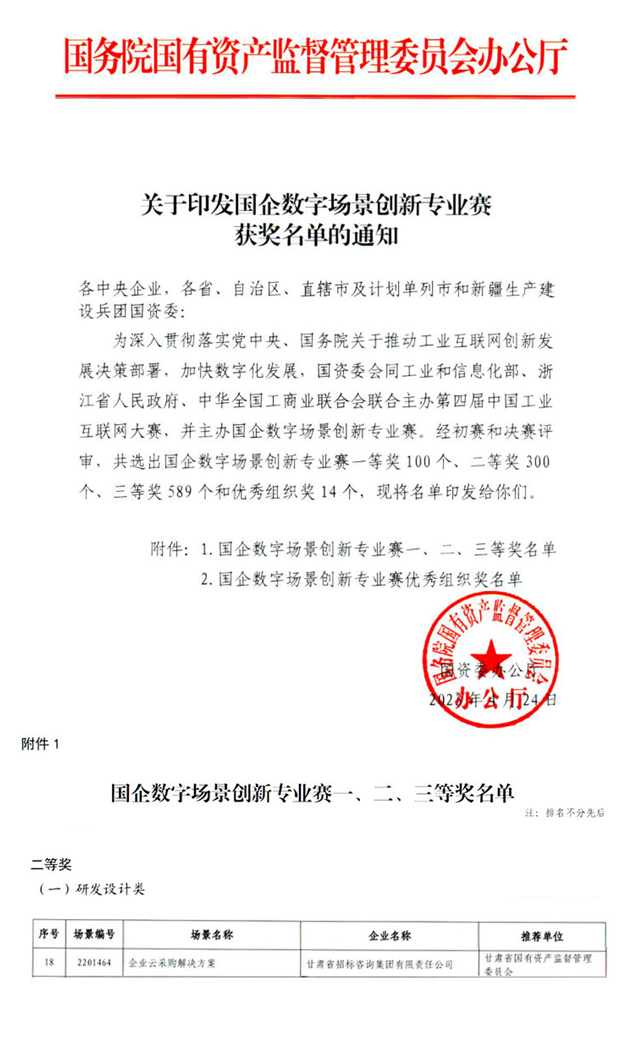 近日,國務院國資委公布了首屆“國企數字場景創新專業賽”獲獎名單。甘肅工程咨詢集團組織推薦的“甘招企業云采購平臺”創新場景,在全國2007家參賽企業推薦的3277個場景中脫穎而出,榮獲二等獎!