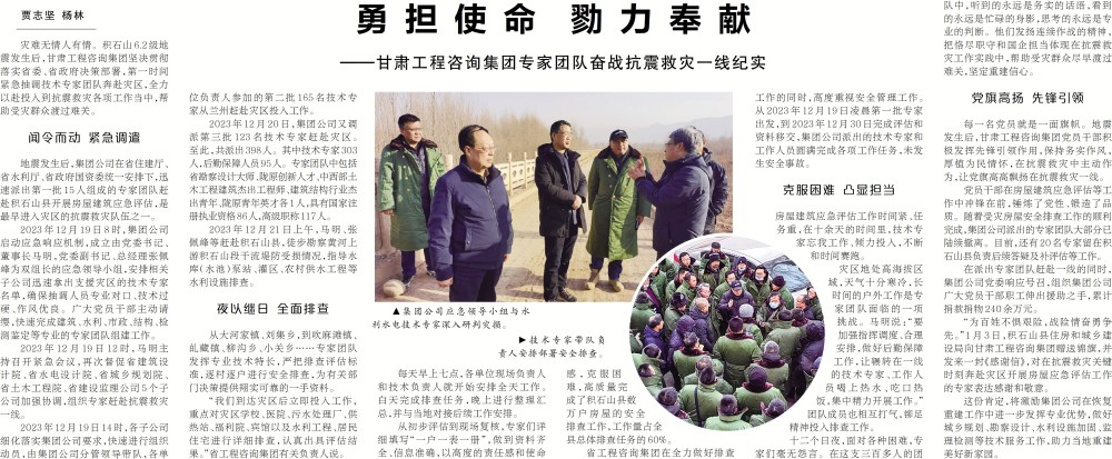 1月15日,《甘肅日報》第4版刊載《勇擔使命 勠力奉獻——甘肅工程咨詢集團專家團隊奮戰抗震救災一線紀實》。該報道全面反映了集團公司黨委心系災區、聞令而動的一系列擔當作為務實舉措,深度展現了專家團隊和干部職工向險而行、甘于奉獻的抗震救災生動實踐,進一步凝聚起奮力奪取抗震救災全面勝利的強大力量。