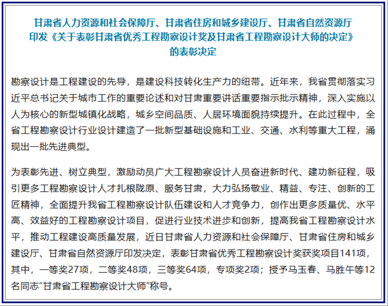 5月中旬,省人力資源和社會保障廳、省住房和城鄉建設廳、省自然資源廳印發《關于表彰甘肅省優秀工程勘察設計獎及甘肅省工程勘察設計大師的決定》,甘肅工程咨詢集團38項勘察設計項目(作品)獲“甘肅省優秀工程勘察設計獎”,其中一等獎9項,二等獎16項,三等獎13項;毛明強、李中輝、張嶺峻獲“甘肅省工程勘察設計大師”稱號。