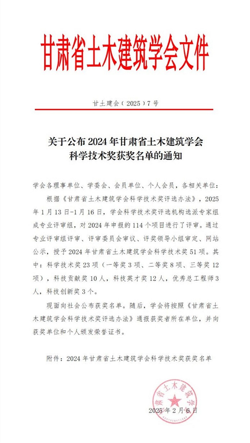 甘肅工程咨詢集團榮獲多項2024年甘肅省土木建筑學會科學技術獎