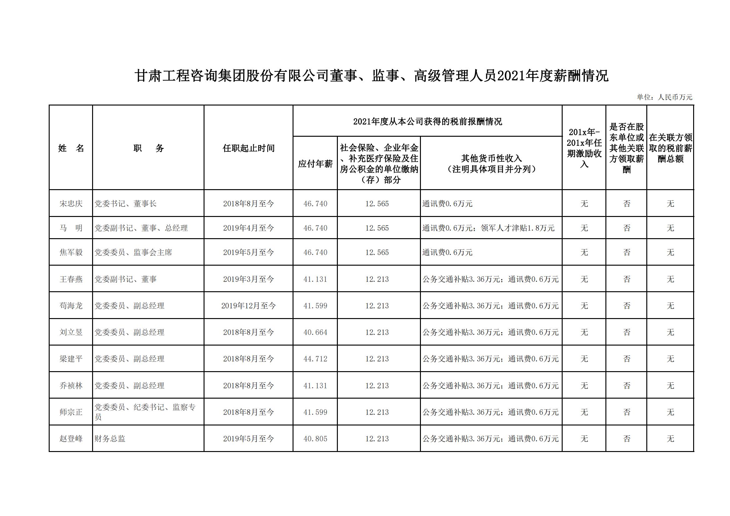 甘肅工程咨詢集團股份有限公司董事、監事、高級管理人員2021年度薪酬公示