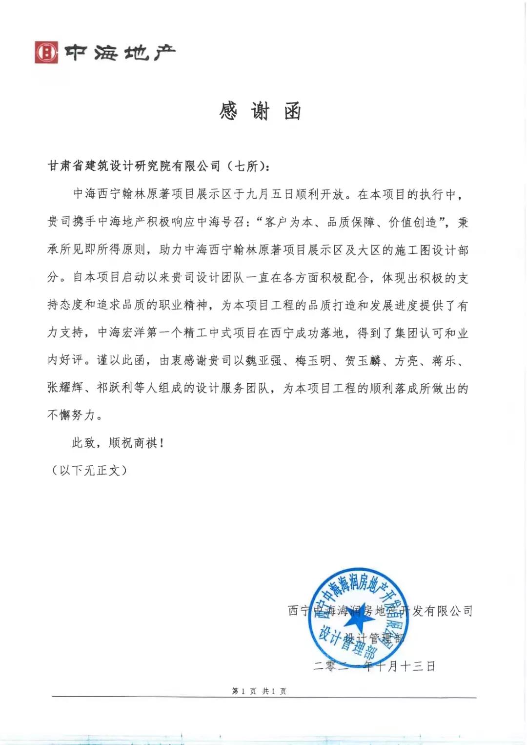 日前,建筑設計院收到來自西寧中海地產的一封感謝信,贊揚設計七所魏亞強、梅玉明、賀玉麟、方亮、蔣樂、張耀輝、祁躍利組成的設計團隊在中海西寧翰林原著項目展示區及大區施工設計中的突出表現。