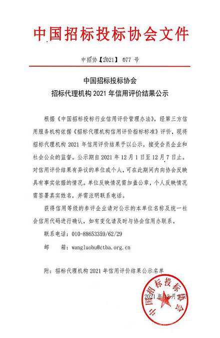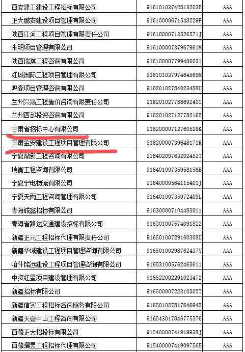 近日,在中國招標投標協會牽頭組織的2021年招標代理機構級信用評價認證工作中,經中招協委托的第三方信用服務機構(國資委)商業信用中心及有關行業專家評審,招標咨詢集團子公司甘肅省招標中心有限公司和甘肅金安建設工程項目管理有限公司獲得2021年招標代理機構AAA級信用評價最高等級認證。