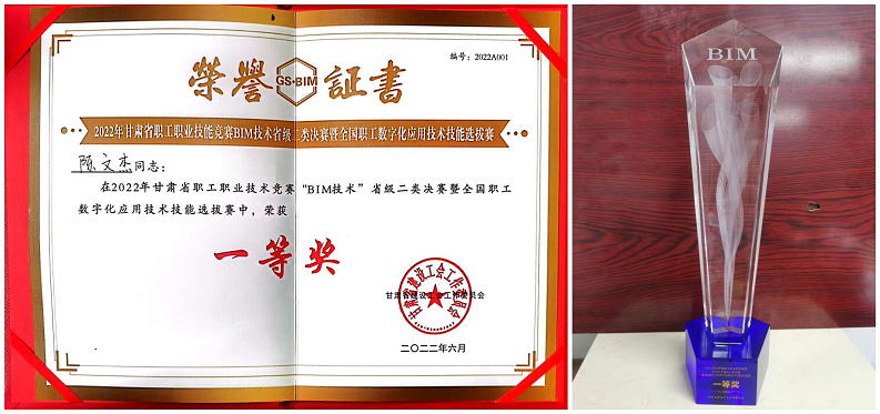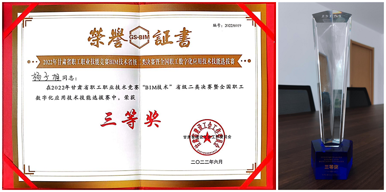 近日,在甘肅省職工職業技能競賽“BIM 技術”省級二類決賽暨全國職工數字化應用技術技能選拔賽中,甘肅省建筑設計研究院有限公司榮獲優秀組織獎,選送的參賽選手陳文杰和楊子旭分別榮獲一、三等獎。