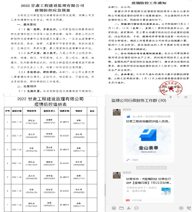 統籌部署,扎牢戰疫“防控網”。7月10日,面對本輪嚴峻復雜的疫情防控形勢,建筑設計院監理公司黨支部高度重視,迅即行動,搶抓“時間窗口”,建立完善疫情防控預案,印發《疫情防控工作通知》,落實機關職能部門居家辦公要求,統籌安排項目駐地疫情防控、生產推進及員工生活保障等各項工作;配套制定《監理公司疫情期間值班表》,領導班子成員輪流帶班,中層管理干部、后勤車輛排班值守,靠實班子、部門、員工“三方責任”,對員工異常情況每日排查,扎牢戰疫“防控網”。