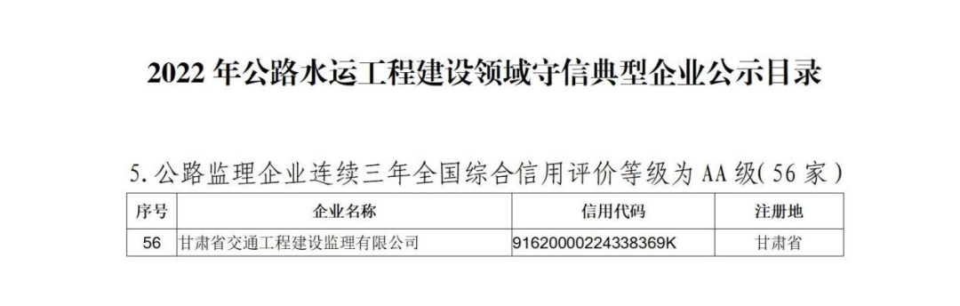 甘肅省交通工程建設監理有限公司上榜交通運輸部公路水運工程建設領域守信典型企業目錄