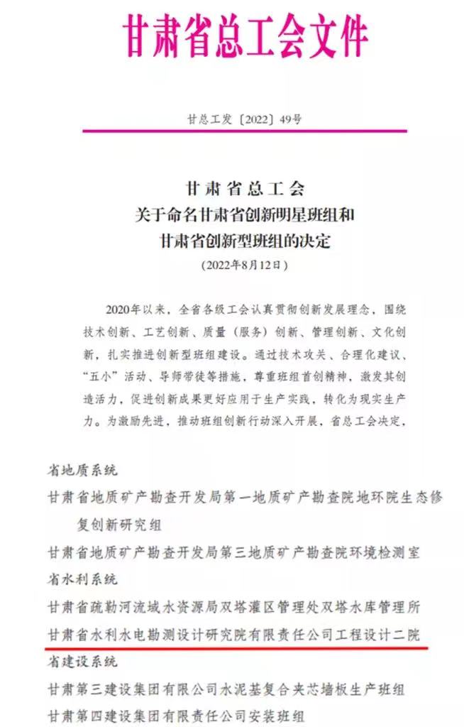 近日,甘肅省總工會發布2022年度“甘肅省工人先鋒號”和“甘肅省創新型班組”名單,甘肅省水電設計院的勘探公司榮獲2022年度“甘肅省工人先鋒號”稱號,工程設計二院榮獲“甘肅省創新型班組”榮譽稱號。