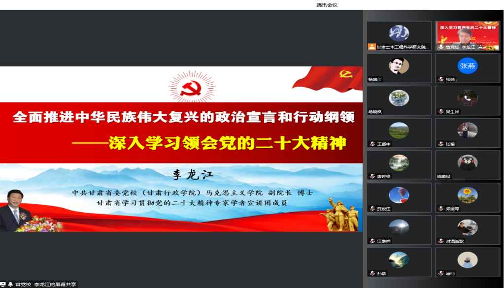 12月14日,甘肅土木工程科學(xué)研究院有限公司以視頻會(huì)議形式召開黨委理論學(xué)習(xí)中心組學(xué)習(xí)(擴(kuò)大)會(huì)議暨黨的二十大精神專題培訓(xùn)輔導(dǎo)講座。黨委副書記、監(jiān)事會(huì)主席、工會(huì)主席張磊主持會(huì)議,領(lǐng)導(dǎo)班子成員、全體黨員、中層干部、入黨積極分子參加。