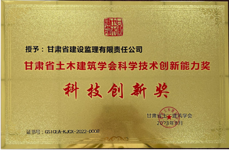 近日,省建設(shè)監(jiān)理公司榮獲“甘肅省土木建筑學(xué)會(huì)科技創(chuàng)新獎(jiǎng)”。此獎(jiǎng)項(xiàng)充分肯定了公司核心技術(shù)能力,彰顯了公司的品牌實(shí)力和行業(yè)影響力。