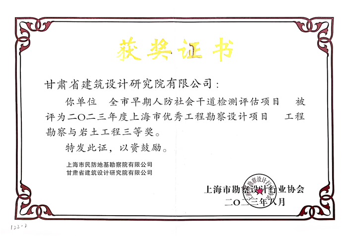 本次獲獎項目由省建筑設計院檢測中心聯合上海市民防地基勘察院有限公司,就蘭州市七八十年代人防社會干道開展檢測鑒定。項目獲獎,彰顯了省建筑設計院在工程勘察設計和檢測鑒定方面的創新能力和技術水平,也是對公司檢測業務板塊整體運營效率、綜合服務能力的再一次肯定。