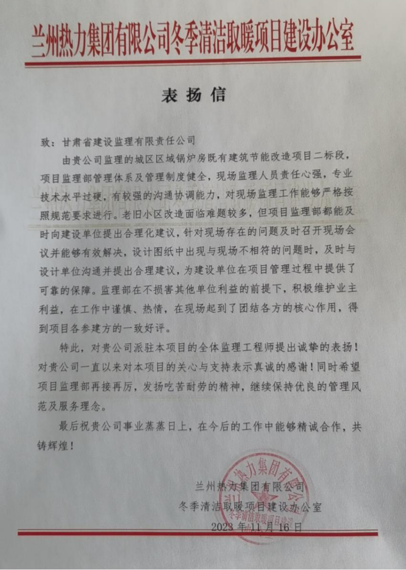 近日,省建設監理公司收到蘭州熱力集團有限公司冬季清潔取暖項目建設辦公室發來的表揚信,對省建設監理公司城區區域鍋爐房既有建筑節能改造項目二標段監理部全體人員表示感謝。