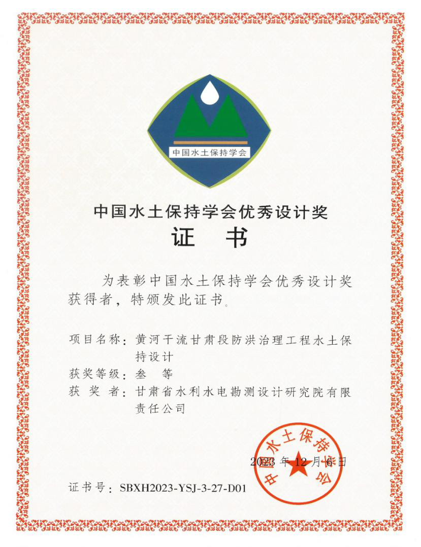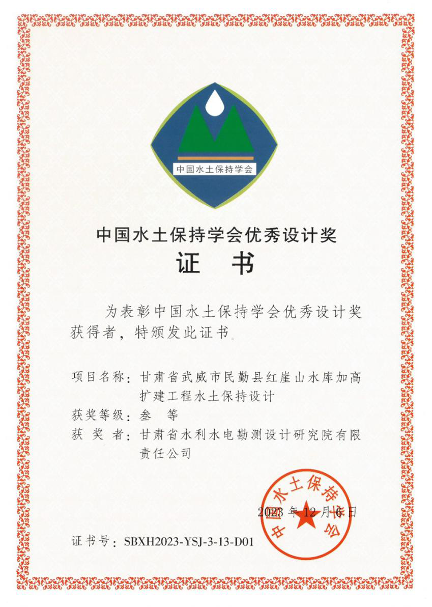近日,第四屆中國水土保持學術大會在福建福州舉行。省水電設計院勘測設計的《武威市民勤縣紅崖山水庫加高擴建工程水土保持設計》《黃河干流甘肅段防洪治理工程水土保持設計》兩項水土保持設計成果榮獲第四屆中國水土保持學會優秀設計三等獎。